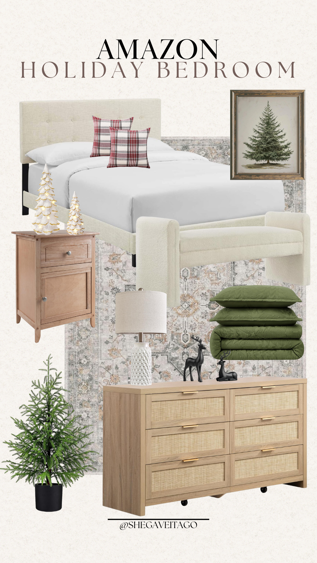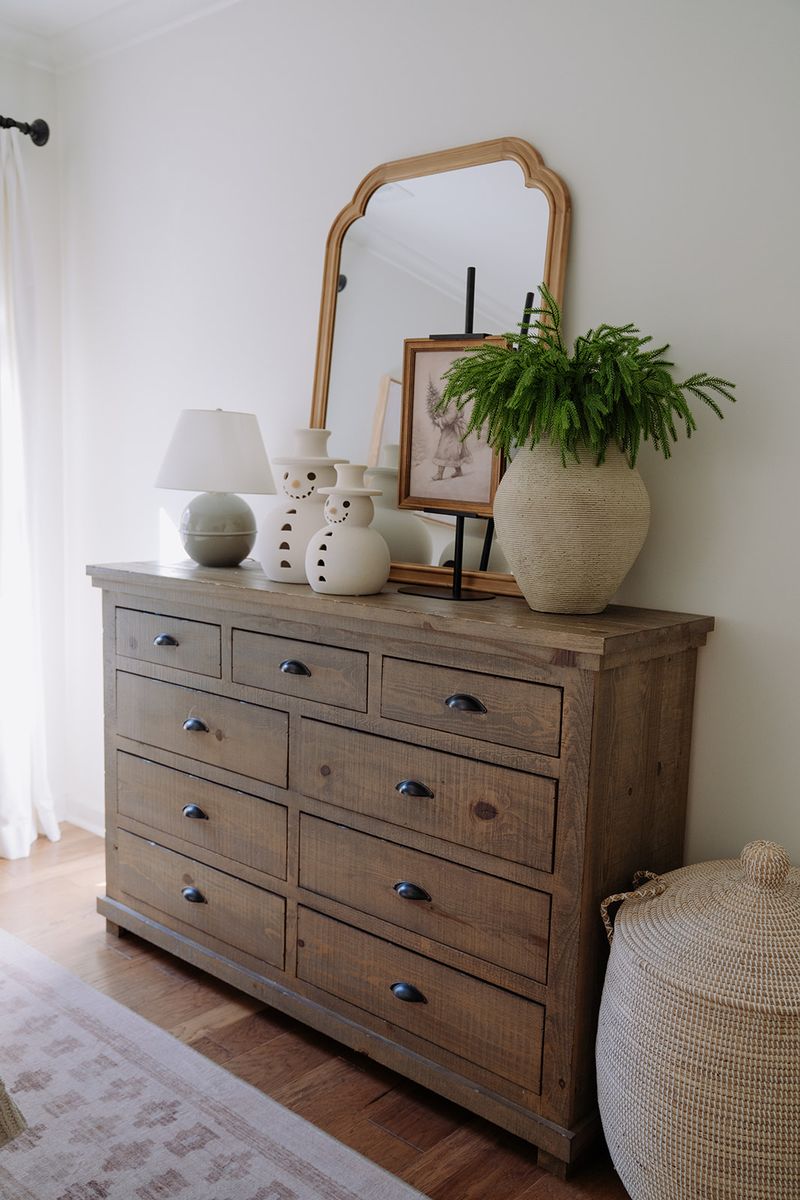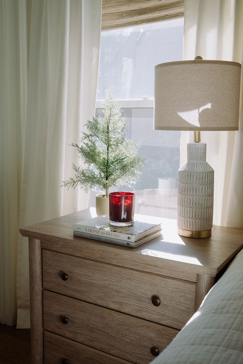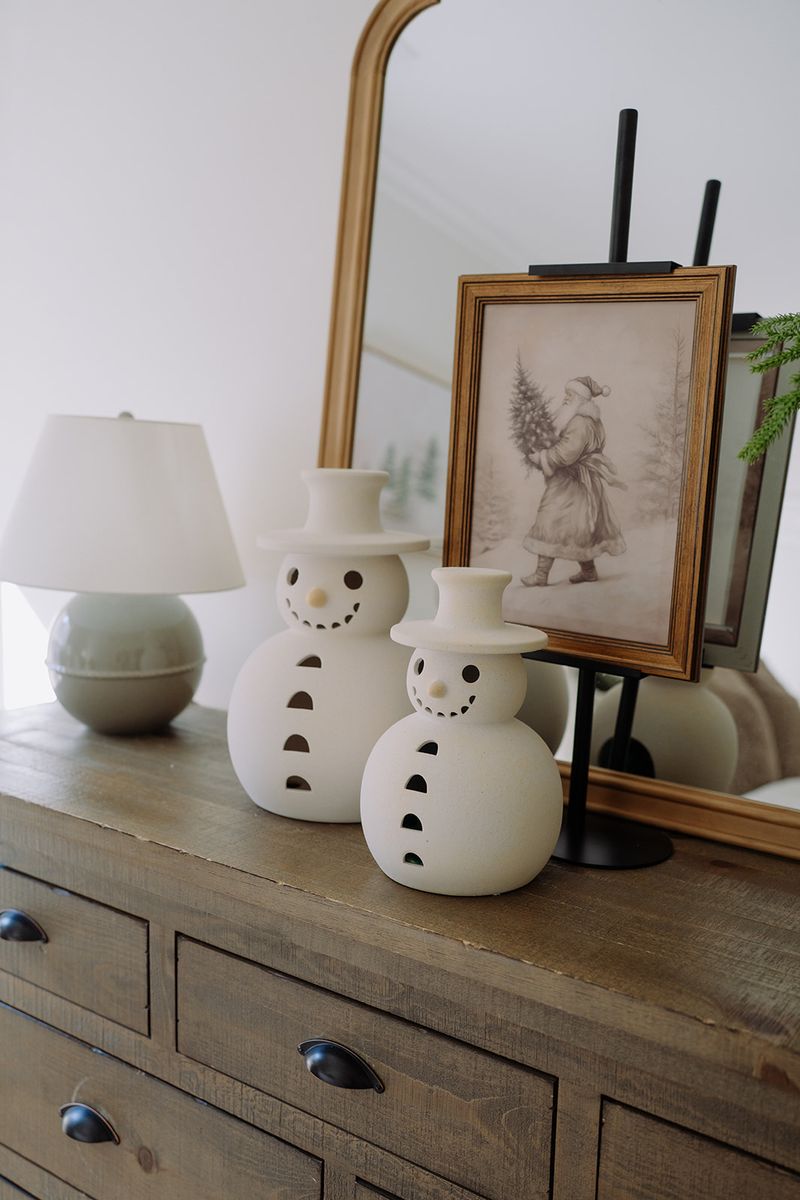 For the bedroom, I wanted to bring in subtle touches of Christmas while keeping the space calm and cozy. Layers of soft neutrals, textured pillows, and warm lighting create a restful retreat for the season. A few simple additions, like mini trees, snowman accents, and winter-inspired artwork add just the right amount of festive charm