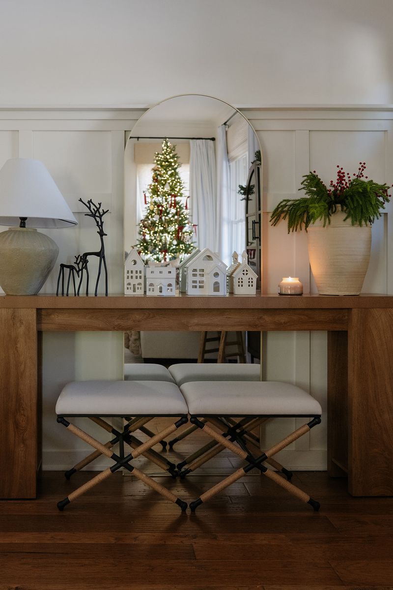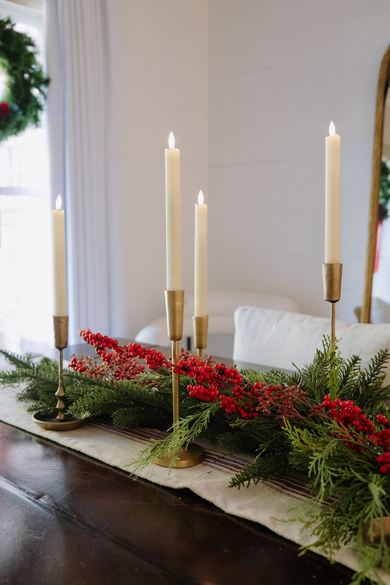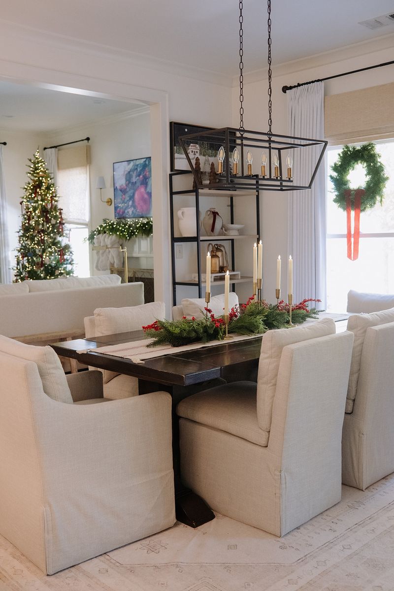 I love creating a warm and welcoming feel in the dining room since it’s the space where everyone gathers. I like to keep the decor simple, some wreaths on the windows, garland draped over the mirror and table, and a few glowing candlesticks to tie it all together.