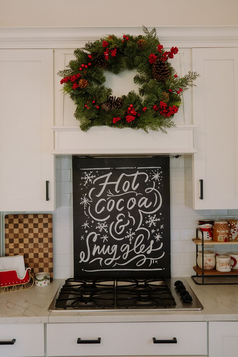 The kitchen is truly the heart of our home during the holidays. I added small touches of Christmas cheer with a festive wreath, garland, and my favorite seasonal mugs and canisters.