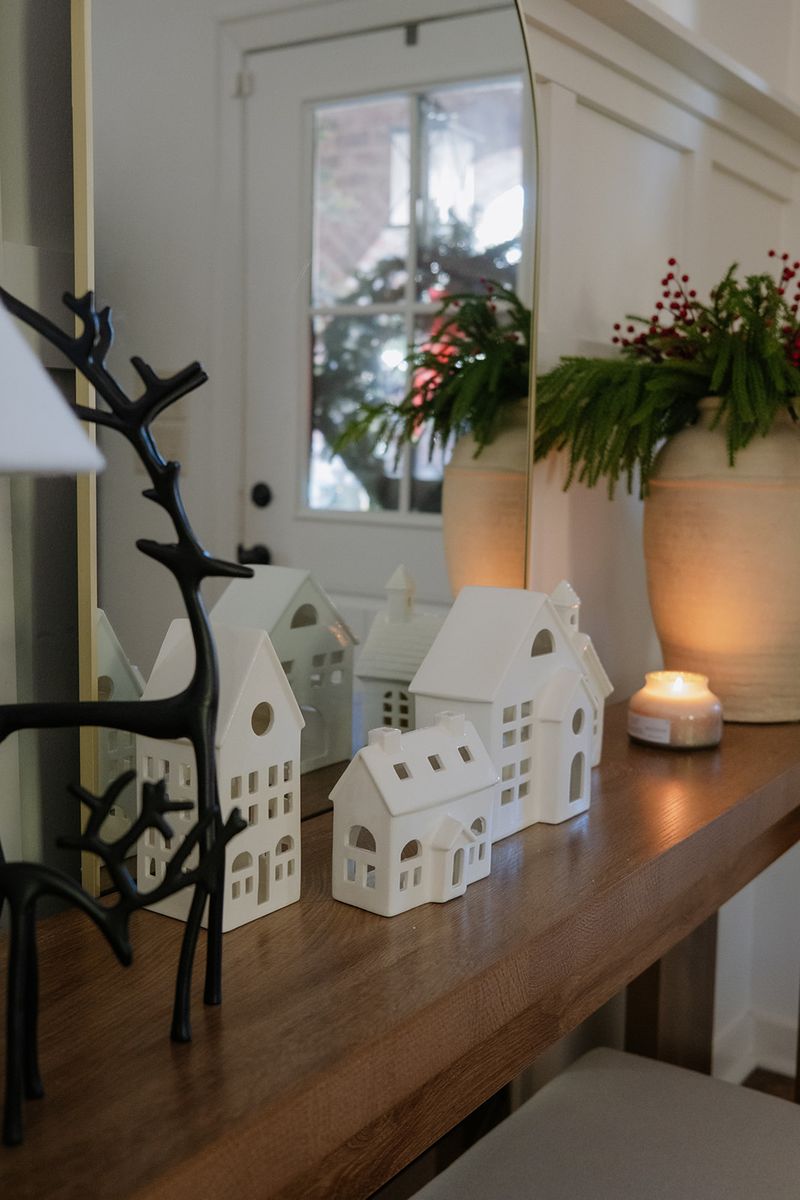 The front porch and entryway of our home is always one of my favorite spots to decorate. This is everyone’s first impression and where the magic begins, the giant nutcrackers are always a hit and the garland adds a cozy feel. The simple entryway table decor sets the tone for the rest of the house.