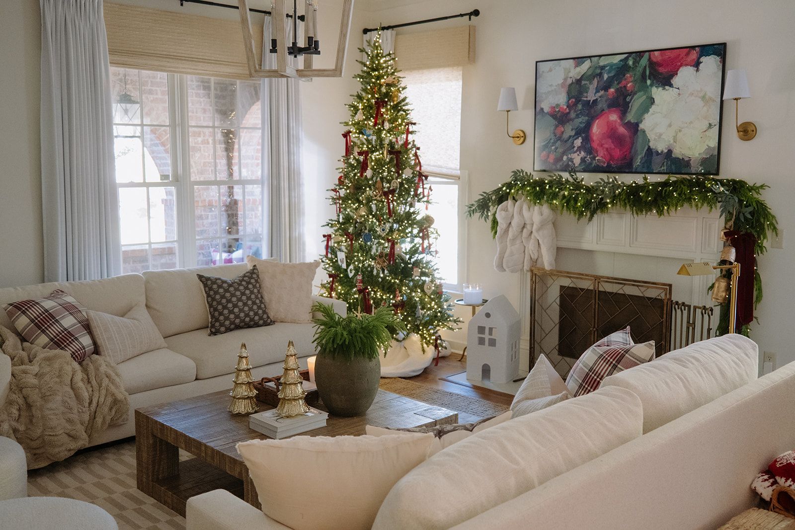 The main attraction! The living room is where I put our Christmas tree every year so this feels like the center of all the Christmas decor. I always have the most fun decorating this room because of everything that goes into it, the tree, stockings hung on the fireplace, coffee table decor, and festive throw pillows!