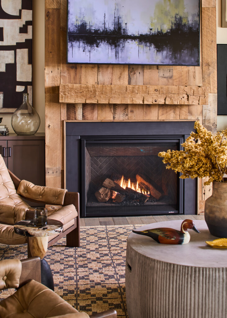 A large fireplace anchors the living room, bold contrast, and large-scale artwork that gives the space presence while still feeling cozy and inviting.
