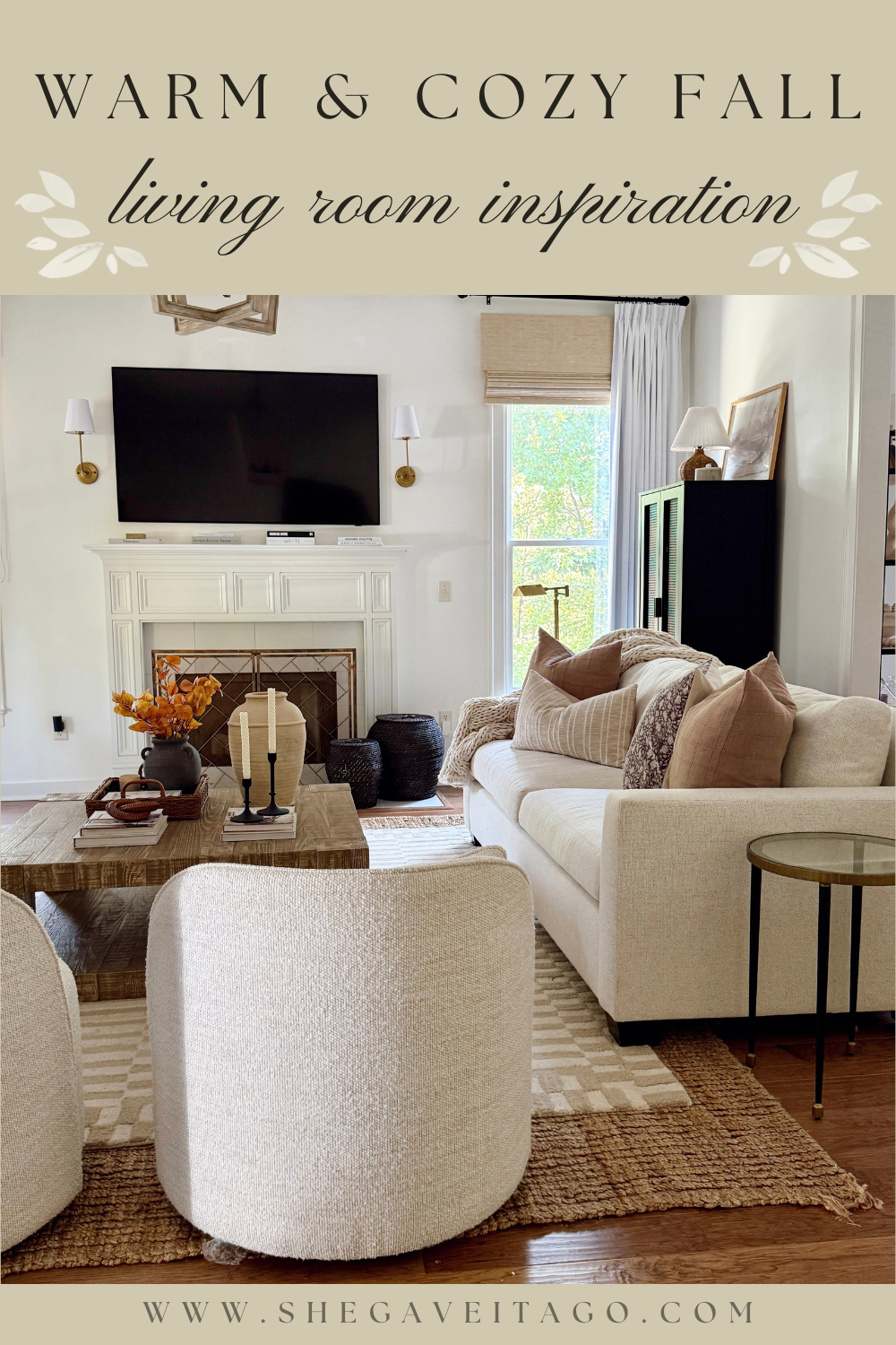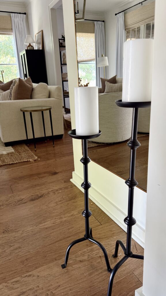 The little details make the biggest impact. From woven baskets to candleholders and fireplace accents, these subtle layers bring texture, warmth, and personality to the living room, completing the cozy fall look.