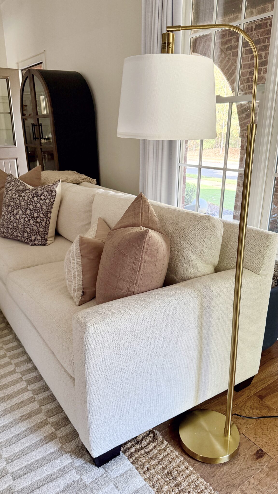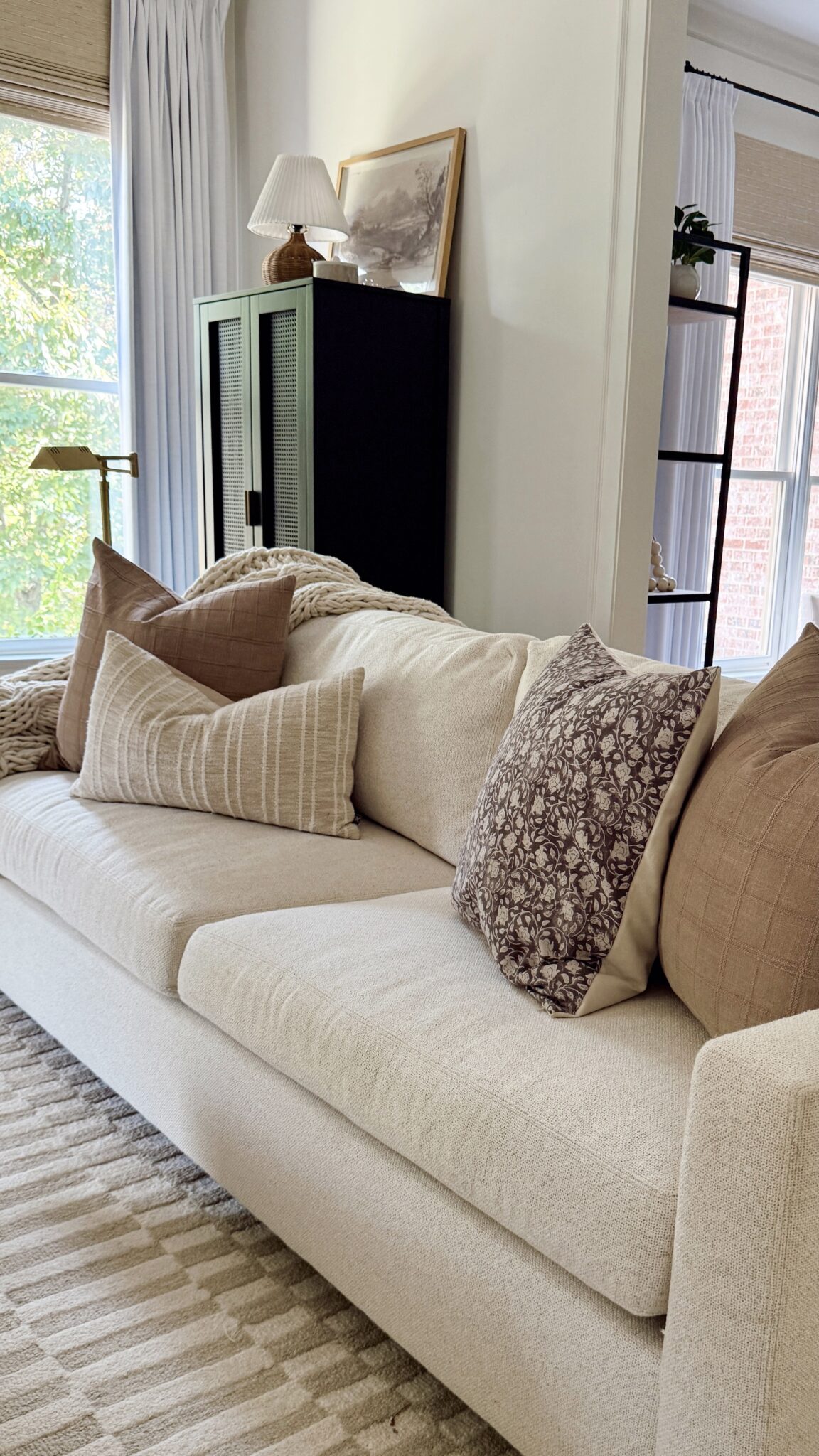 Couch | Linen Checkered Throw Pillow | Floral Throw Pillow | Lumbar Pillow | Rug | Floor Lamp