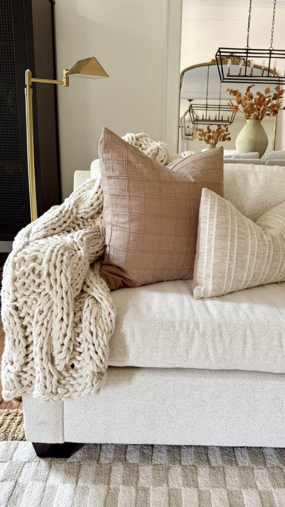 Nothing says fall like a soft throw draped over the sofa. Layering chunky knits and woven textures not only adds warmth but also brings depth and dimension to your living room styling.